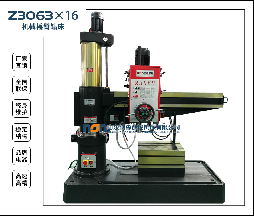6、搖臂導軌,外柱圓表面,主軸、主軸套筒及內外柱回轉滾道等處均進行了淬火處理,可長期保持機床精度